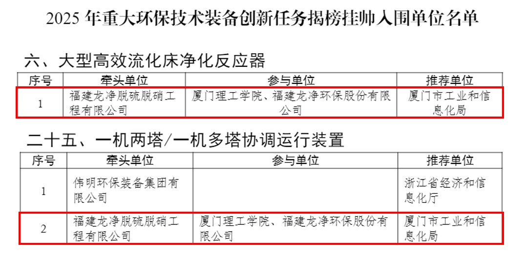 近日,工业和信息化部公示2025年重大环保技术装备创新任务揭榜挂帅入围名单。由福建龙净牵头申报的“大型高效流化床净化反应器”与“一机两塔/一机多塔协调运行装置”两项技术装备,成功跻身入围名单。